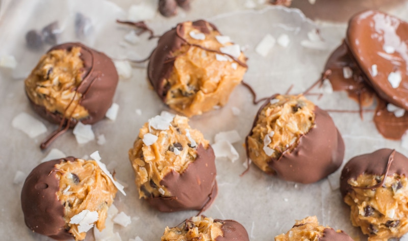 Imagine edible cookie dough dipped in chocolate—that’s what you have in this recipe from Mixed & Measured blogger Riley Yahr. Add chopped pecans, dried fruit, or dust with more coconut for an added treat.